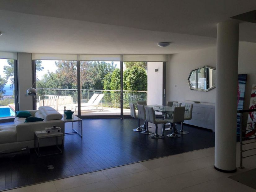 The home stands out for its spacious layout, natural light and contemporary design. It features four bedrooms, each with its own en-suite bathroom equipped with a hydromassage bathtub and separate shower, as well as a guest toilet. The large open-plan living area connects seamlessly with a modern kitchen and leads out to the private garden, where a beautiful pool creates the perfect space to relax throughout the year. Two additional terraces offer ideal spots to enjoy the panoramic views, and the property includes a private garage for two cars.
