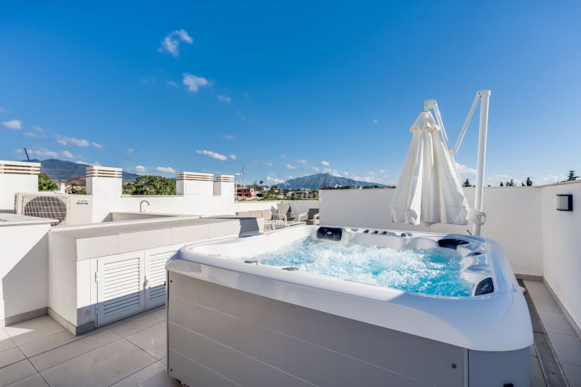 Los Miradores del Sol is a distinctive development situated on the New Golden Mile. This contemporary property features four bedrooms, three bathrooms, and an open-plan dining and living area, with direct access to the communal pool and several terraces, including a spacious rooftop terrace equipped with a BBQ area and Jacuzzi.