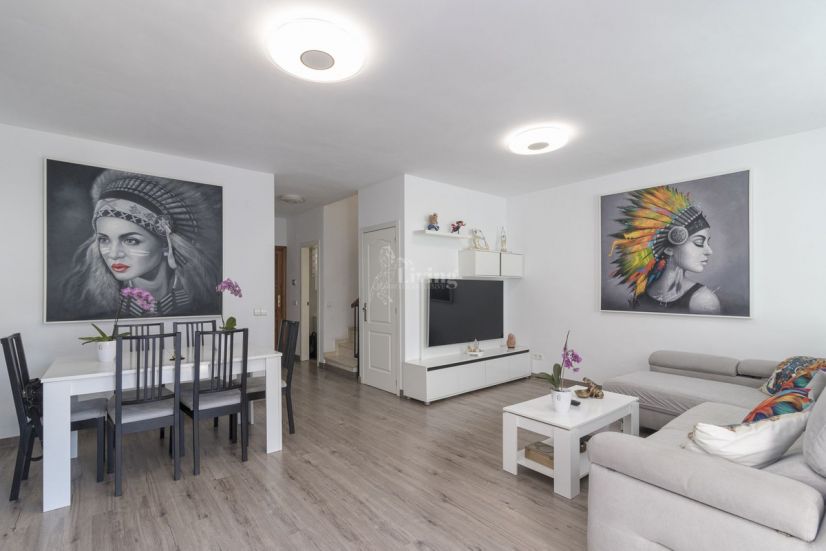 Beautiful townhouse in Selwo, Estepona. The house has 162 square meters of built area. Upon entering, the first floor features a full guest toilet, a fully equipped separate kitchen, a spacious living-dining room with a fireplace, and access to a beautiful terrace of approximately 28 square meters.
