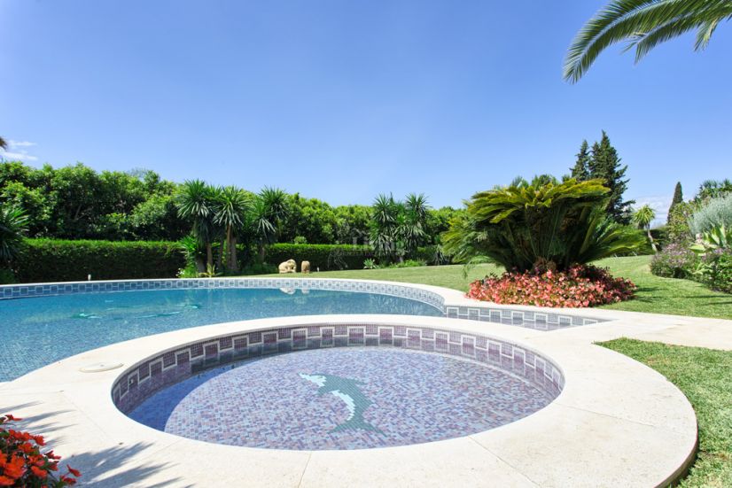 Piscina climatizada de 120 m², libre de cloro y con tratamiento de agua salada, rodeada de jardines tropicales con palmeras, flores, jazmín, rosas y buganvillas.