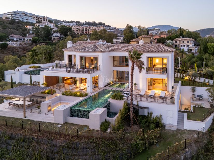 Villa Cina disfruta de una posición privilegiada, ofreciendo vistas panorámicas de 360º al mar, las montañas y los campos de golf. A pesar de su entorno tranquilo, la villa cuenta con fácil acceso a tiendas de diseño, playas de arena, campos de golf de campeonato y los vibrantes núcleos urbanos de Marbella y Puerto Banús, a solo unos minutos en coche.Esta elegante villa de 5 dormitorios ha sido diseñada de manera individual y cuenta con baños en suite, amplias y luminosas zonas de estar con chimenea, y una cocina de última generación. La suite principal dispone de una terraza orientada al sur, mientras que los cuatro dormitorios de invitados también cuentan con baños en suite. Otros aspectos destacados incluyen una bodega, sala de entretenimiento, gimnasio, sala de masajes, tres aseos para invitados, lavandería con cuatro máquinas y, ahora, un ascensor privado que aporta comodidad y accesibilidad a la vida diaria.